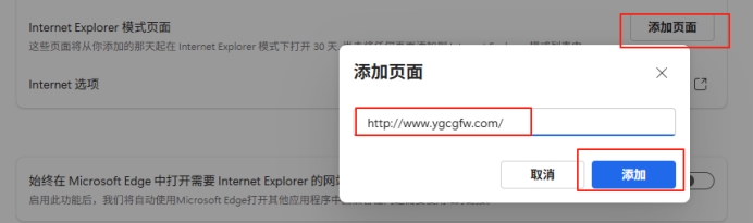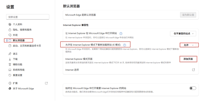 2.点击“默认浏览器”,将右侧“允许在Internet Explorer模式下重新加载网站(IE模式)”设置为“允许”,之后点击“添加”将http://www.ygcgfw.com/网址添加进去。
