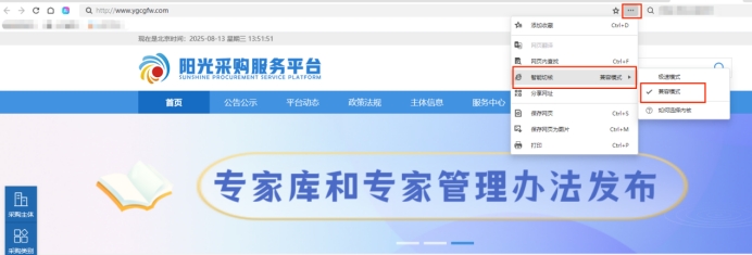 点击浏览器打开www.ygcgfw.com后,点击网址栏后的闪电图标或者三个点的图标,选择“IE模式或者兼容模式”,则浏览器模式切换成功。两种方式如下图。